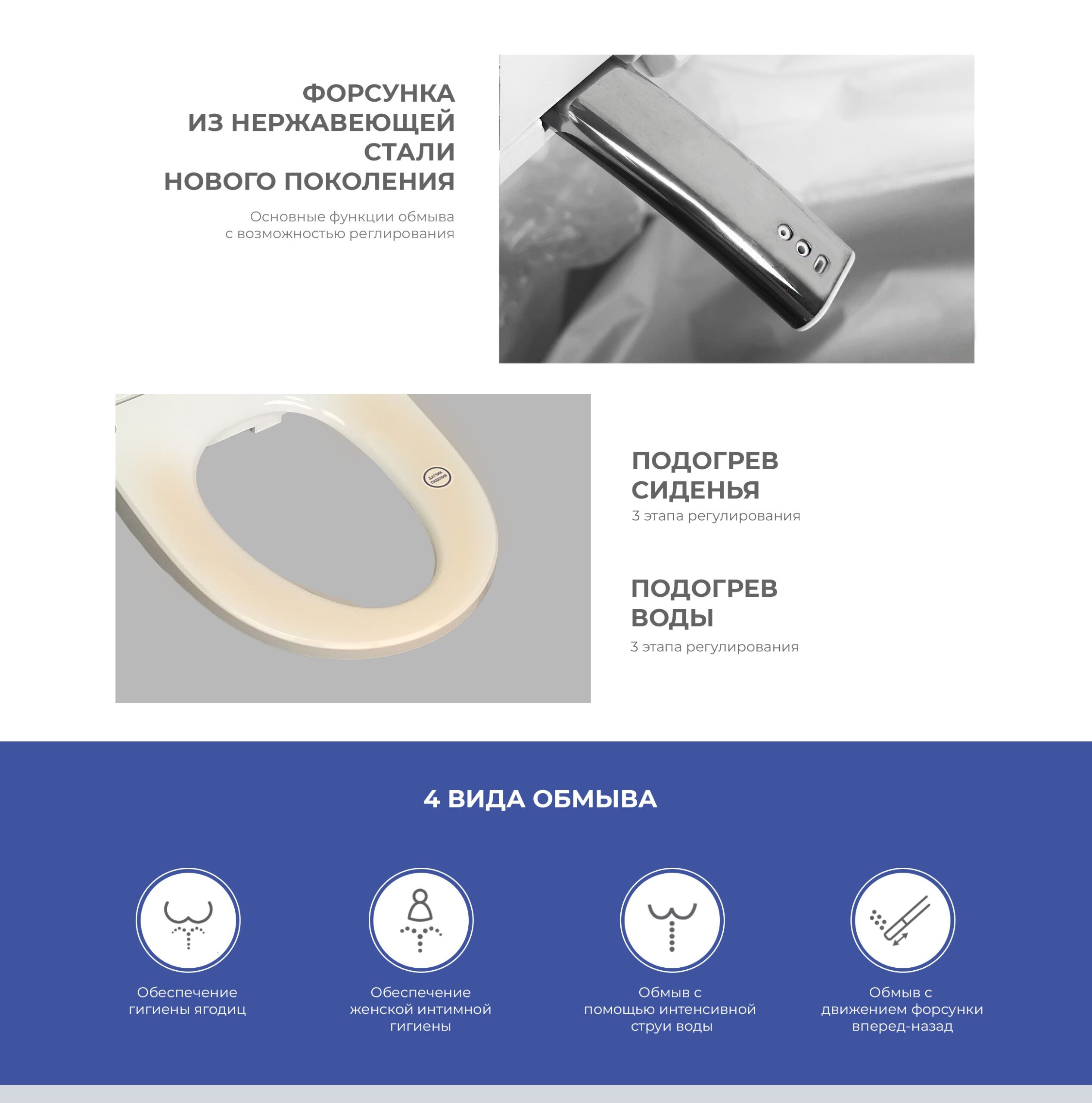 Функции и особенностиАвтоматическое запоминание настроек, Автоматическое открывание/закрывание, Гидромассаж посредством подвижных форсунок, Дополнительная боковая панель управления, Женское биде, Клизменный обмыв, Микролифт крышки и сиденья, Общий обмыв, Подогрев сиденья, Пульт Д/У, Регулировка давления воды, Регулировка положения форсунки, Регулировка темепратуры сиденья, Регулировка температуры воды, Режим «Дети», Русификация, Сенсор присутствия, Сиситема электробезопасности, Сушка, Ультразвуковая спайка (влагозащита корпуса)